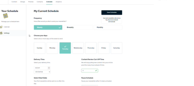 Welcome to the Schedule page! This is where you can set and control the schedule for your newsletter. First off, you will choose your frequency, day, or days of the week, delivery time, time zone, and start date, as well as your content review cut-off time. Your content review cut-off time is a safety for you to make sure you have enough time to review your contact before the newsletter sends. For example, if your content review cut-off time is 24 hours, then the system knows to stop Automatically pulling in any new articles for my sources 24 hours prior to my delivery time that way I can go in and review all of my automatically pulled content before send. You can still manually add content and make adjustments to your template up until an hour before send. You can also pause your schedule altogether or if you’d like to skip a send, you can toggle off that particular date on the calendar page. For example, maybe your next send lands on a holiday, you can simply skip sending that day. You can always see your next scheduled send in the right top corner of the schedule page