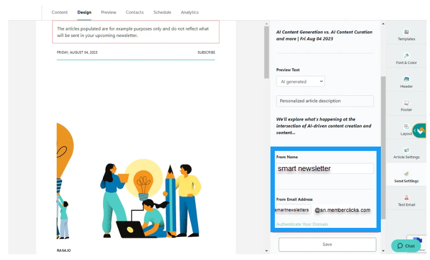 The From Name is the name that will appear in your subscribers' inboxes as who the newsletter is coming from; while the From Email Address is the email address that it will be sent from. The default From Email Address is thiswas@sentwithsmartnewsletter.com. To change the From Name, you can access this on the Design page under the Send Settings to the name of your choosing. In order to change the From Email Address to an account that you manage, you will need to authenticate your domain. We highly recommend sending from an email address that your contacts are familiar with. This reduces the chances of your newsletter ending up in SPAM folders and increases the likelihood that it will end up in your subscribers' inboxes!