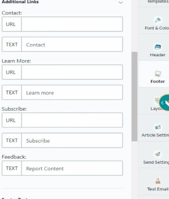 To edit these links, go to Design > Footer > Additional Links dropdown. Editing the subscribe link here will also change the subscribe link in your header. You also have the option to remove the subscribe link completely in your header by using the toggle in the Header tab. You have the ability to enter text in the footer as well in the Text 1 and Text 2 boxes. Lastly, you can include a Footer Logo; you can adjust the size and also provide a link for the photo to link out.