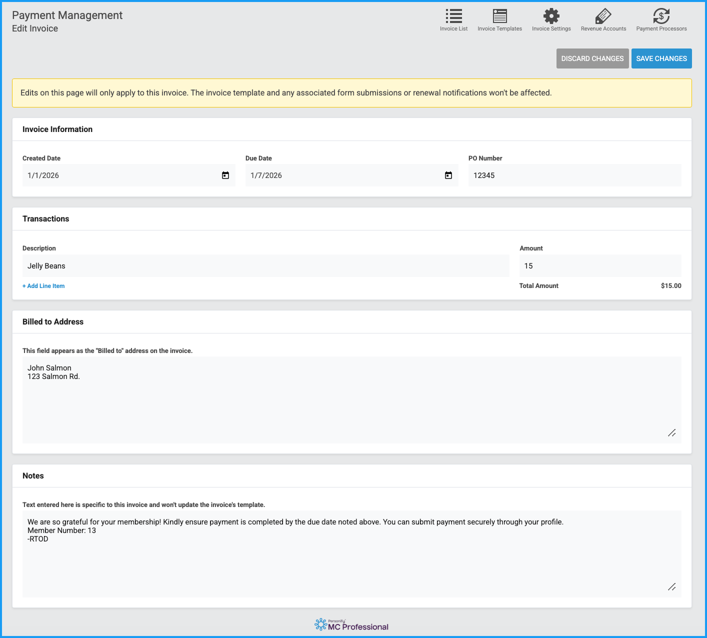 No, editing an invoice only changes the information on that specific invoice. For example, fixing a typo in the Billed To address on an invoice won't update the member's primary address in their profile.