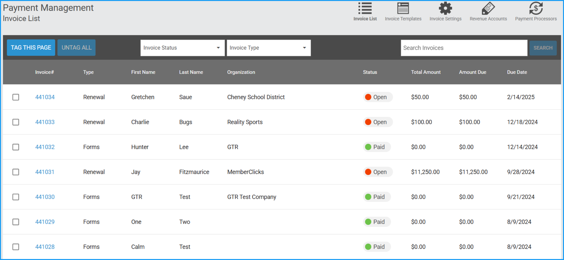 The Invoice List provides a detailed view of all invoices and credit memos in your database. From this page, you can manage, filter, and export invoice data. You can also use the checkboxes on the left or select Tag All to tag invoices to perform bulk actions.