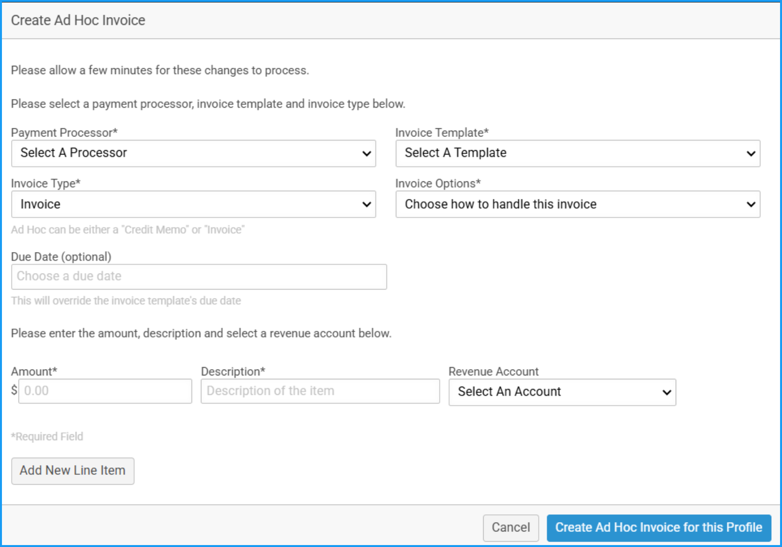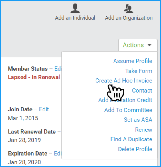 Ad-Hoc invoices and credit memos are manually created by admins for individual profiles or in bulk. This option allows admins to bill members at any time. For instance, you can use this option if a member forgets to make an extra-charge selection on their membership renewal or event registration form.
